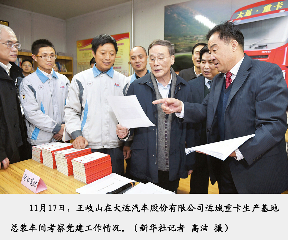 王岐山一行深入美高梅官方网站重卡总装车间,视察美高梅官方网站重卡总装生产线,了解了美高梅官方网站重卡的生产装配过程。并在总装车间的党员活动室了解企业党建情况,同时查看了生产系统党支部党员的学习资料、学习笔记和心得体会。他先后与美高梅官方网站集团董事长远勤山、党委书记牛大鹏、纪检委员李军、生产系统党支部书记周国军等进行了亲切交谈。