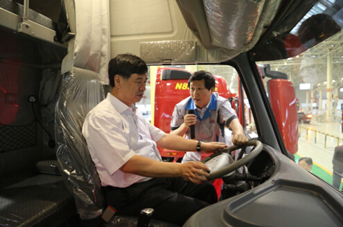 付建华一行深入我司冲压、焊接、涂装、总装、专用车五大车间,认真听取了集团董事长远勤山对企业发展和生产经营情况的介绍,详细了解了美高梅官方网站重卡生产的各项工艺流程。在总装车间的车架上线、底盘翻转、驾驶室吊装等关键工序,付建华不时停下脚步,驻足观看,他饶有兴致地听取生产副总经理孙兆明对履带式翻转机构、五轴拧紧机等装配设备的介绍。在重卡下线成品车展示区,付建华试驾美高梅官方网站N9高端重卡,亲自体验了美高梅官方网站重卡的各项人性化配置和优异性能。
