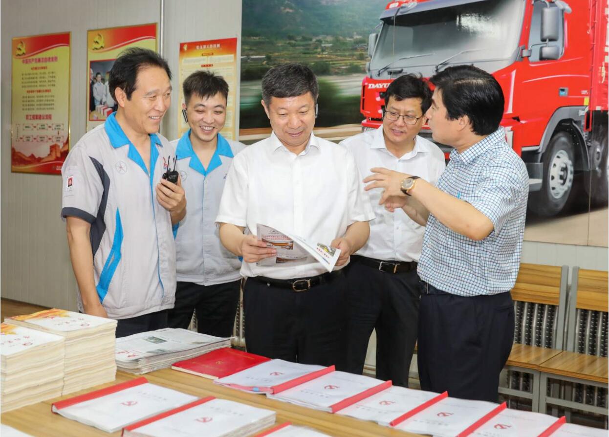 王拥军一行先后深入我司冲压、焊接、涂装、总装生产车间,详细了解了美高梅官方网站重卡的生产工艺流程、质量控制、技术创新、规范操作、安全生产等情况。调研过程中,远勤山董事长向王拥军一行介绍了近年来企业的生产经营状况,并重点介绍了在模范先锋岗位涌现出来的优秀共产党员,肯定了党员同志们在推动企业长期稳定发展中的作用。