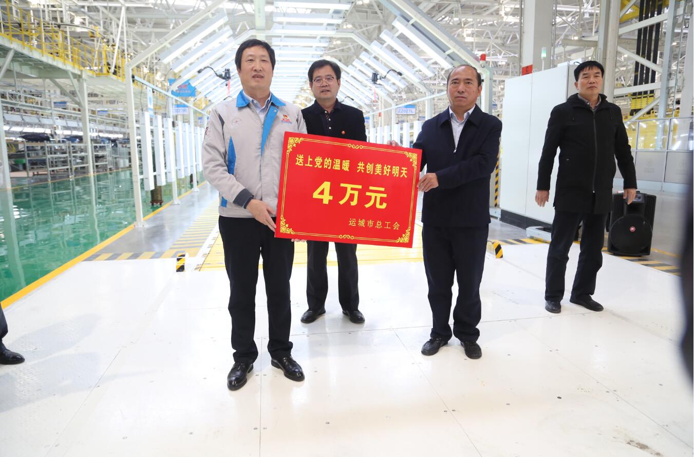 10月16日,运城市人大常委会副主任、市总工会主席杜自立,运城市总工会党组书记、常务副主席梁武军,运城市总工会党组成员、副主席、一级调研员秦全发等领导走访美高梅官方网站新能源汽车生产基地,慰问一线员工并发放慰问金,送来党和政府的关怀。美高梅官方网站汽车股份有限公司工会主席孙兆明,工会副主席马鲁堂、周国军陪同走访。