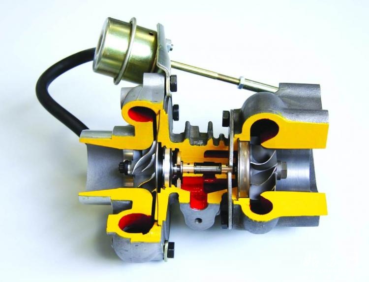 涡轮增压器是利用发动机排出的废气驱动涡轮,涡轮带动同轴的叶轮高速旋转,新鲜空气在叶轮的作用下,被压缩后进入发动机气缸,从而增加了发动机的充气量,使燃油更加充分地燃烧,提高了发动机的输出功率接近40%。涡轮增压器的工作环境十分恶劣,经常处于高温、高压的工作条件,因此对它的正确使用和维护十分重要。