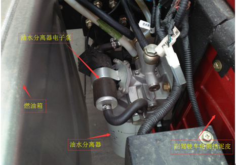 3.检查燃油系统是否有空气。若有空气,则打开电瓶开关,钥匙打到ON档,使低压油泵进行泵油,并发出滋滋滋的泵油声,三分钟为一个周期,三个周期后,启动车辆。