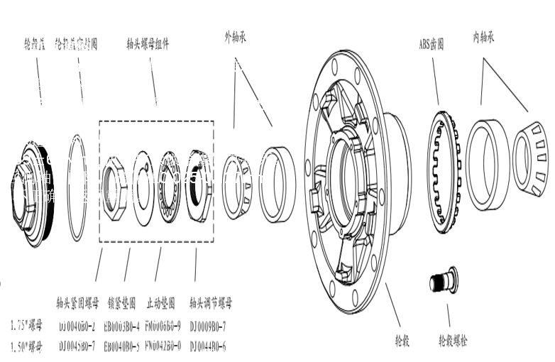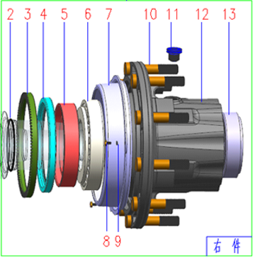 (6):圆锥滚子轴承-后轮毂(内轴承);(13):轮毂轴承(外轴承)