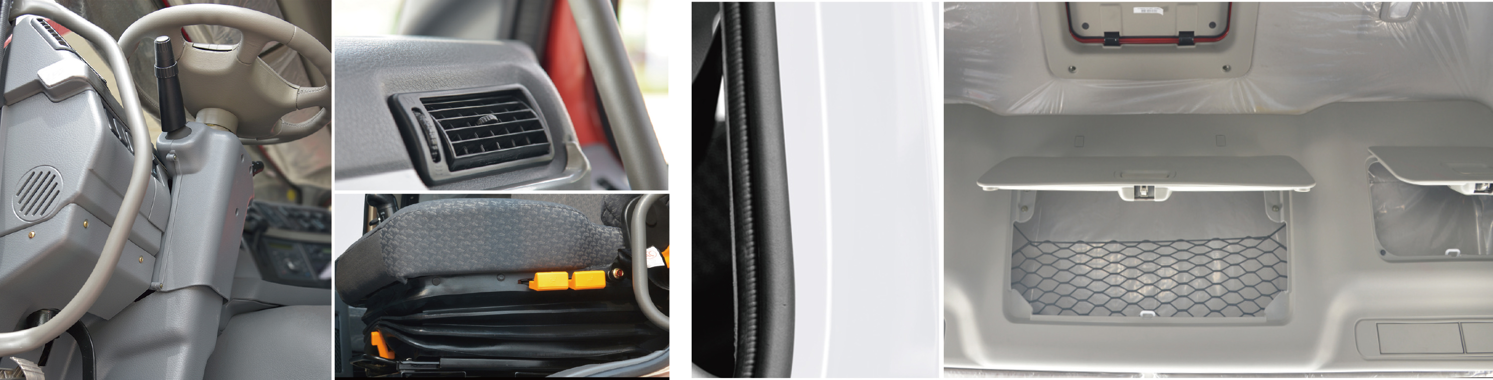 车门密封采用双层密封设计,经过严格的淋浴试验,密封性良好;能有效阻止pm2.5的颗粒进入,保持驾驶室内干净舒适的驾乘环境;行驶时驾驶室内部噪音仅为76分贝。前挡风玻璃上部设计了宽大的储物柜,为长途运输司机提供足够的储物空间。